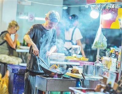 泰国曼谷唐人街是当地最繁华的商业区之一,这里的夜市吸引了大量当地居民和外国游客。图为一家小店的厨师正在烹饪菜肴。