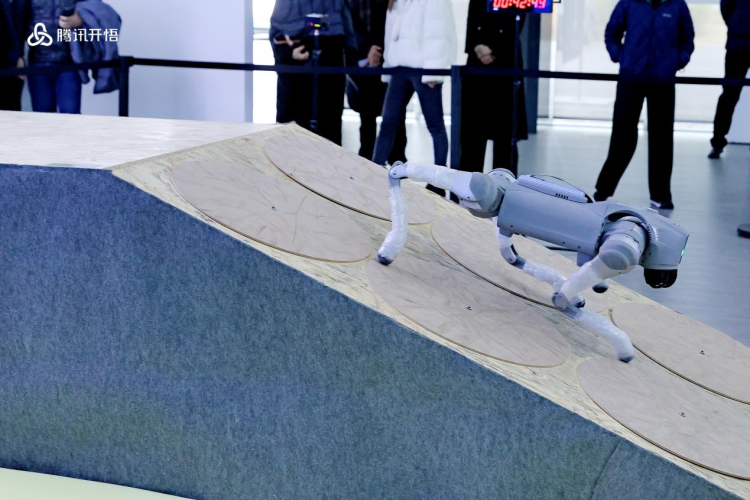 来自西安交通大学的太初团队率先登场,机器狗行进有序且迅捷,直接对隐藏赛道发起挑战,最终凭借后退蓄力策略成功爬坡登顶,赢得现场第一波热烈掌声。