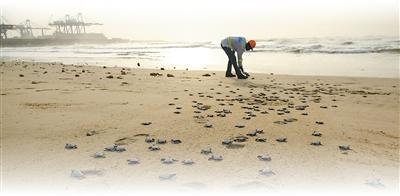 海龟保育专家在加纳特马新集装箱码头附近海滩放生海龟。