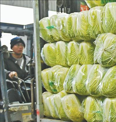 山东省烟台市芝罘区西牟果蔬批发市场,经营户在装运大白菜。