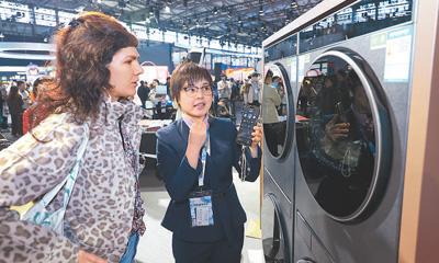 海尔工作人员向观众介绍洗衣机“智慧洗”功能。海外网 谢 明摄